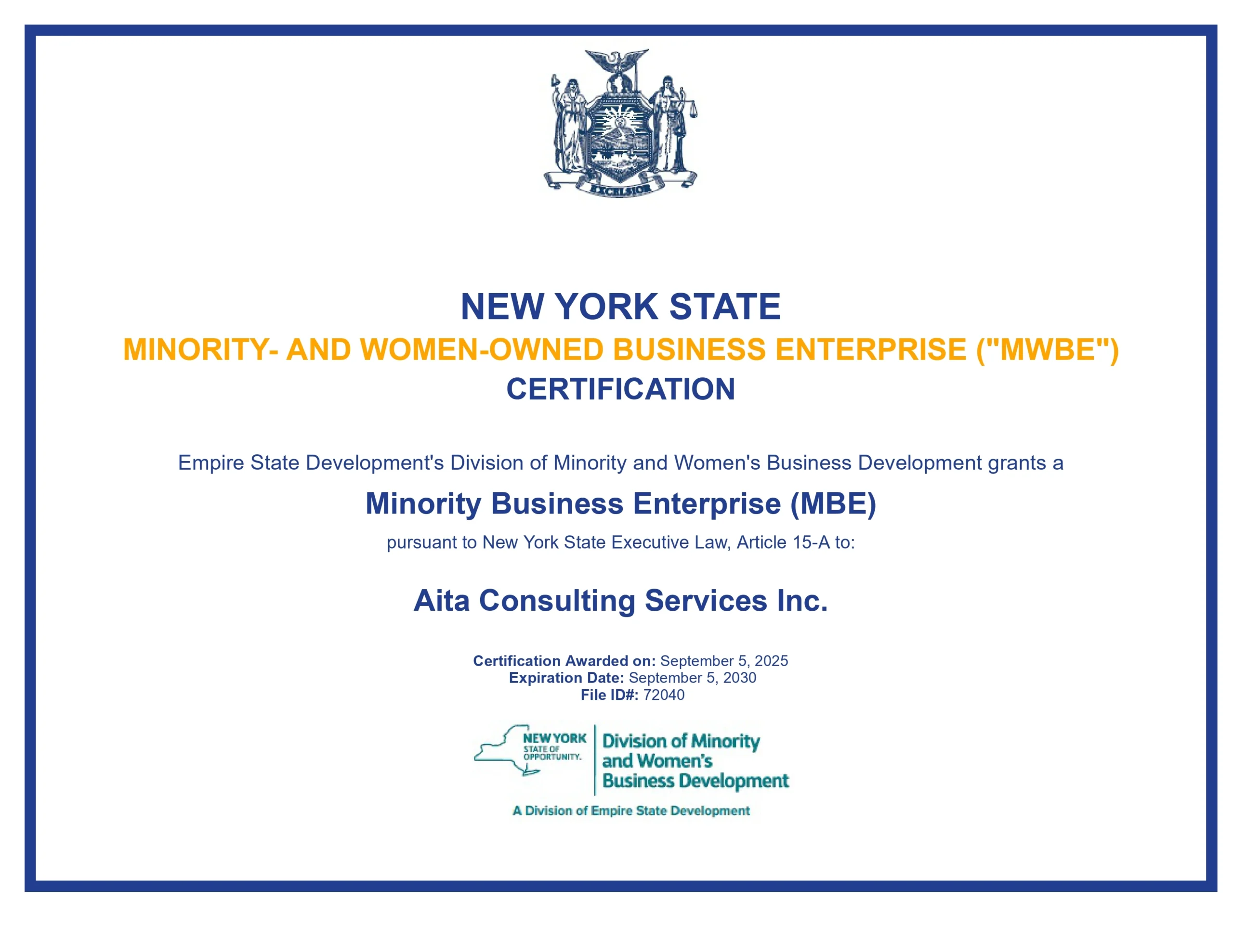 As a New York State MWBE-certified staffing partner, AITA Consulting Services combines certification value with strong talent delivery capability - helping agencies, prime contractors, and commercial organizations meet procurement goals while placing high-quality professionals quickly and compliantly.